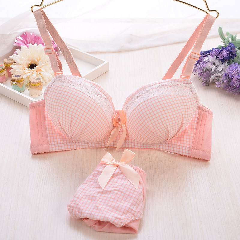 日系学生少女方格棉小清新格子蝴蝶结飞边裤无钢圈文胸内衣套装