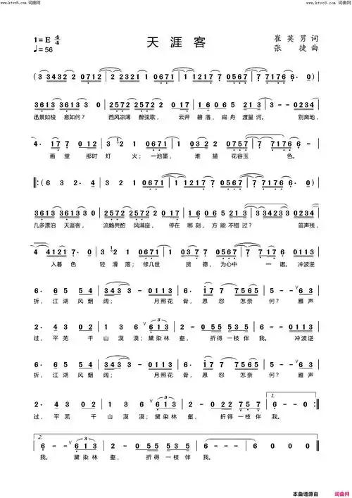 《天涯客》简谱 崔英男作词 张捷作曲 戴晨茗演唱 第1页