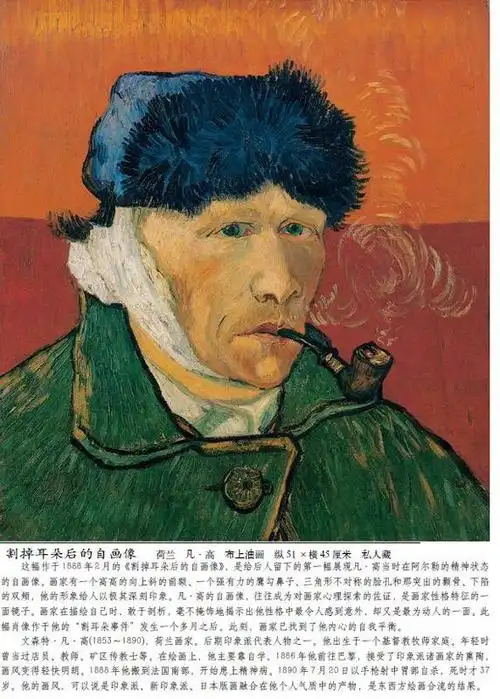 梵高自画像,这张图可以看到耳朵已经割掉了,还裹着厚厚的纱布.