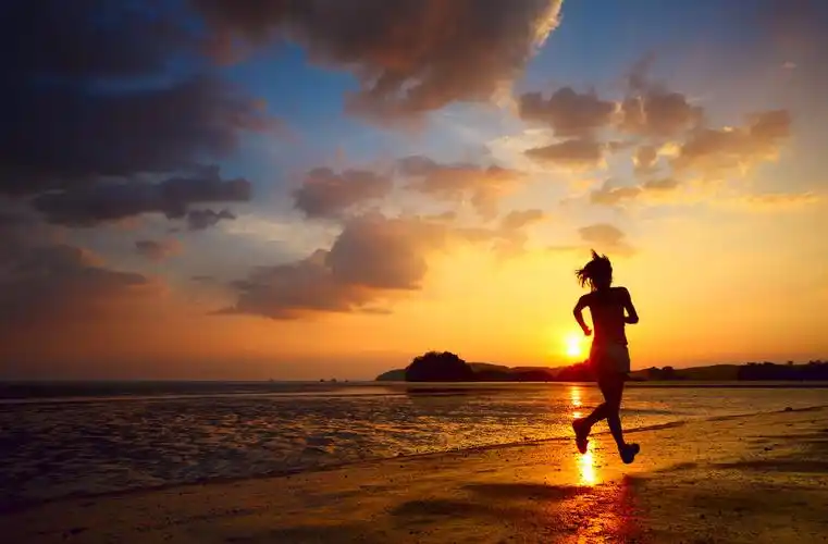 日落时分,跑步者在沙滩上奔跑的背影,背景是太阳.