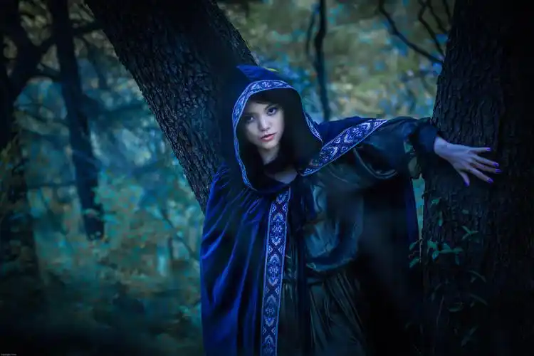 半长的肖像美丽的年轻女子在巫婆的礼服把咒语用魔杖