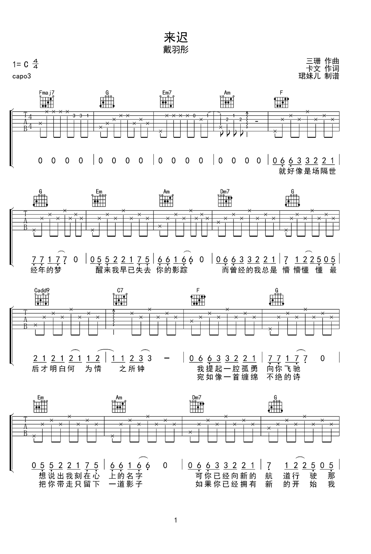 戴羽彤《来迟》吉他谱 原版弹唱六线谱-1