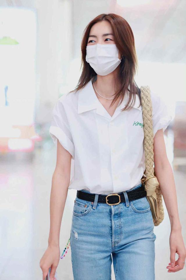今日份的刘雯,清爽的白色衬衣,略有小细节的设计,搭配水洗牛仔裤,真的