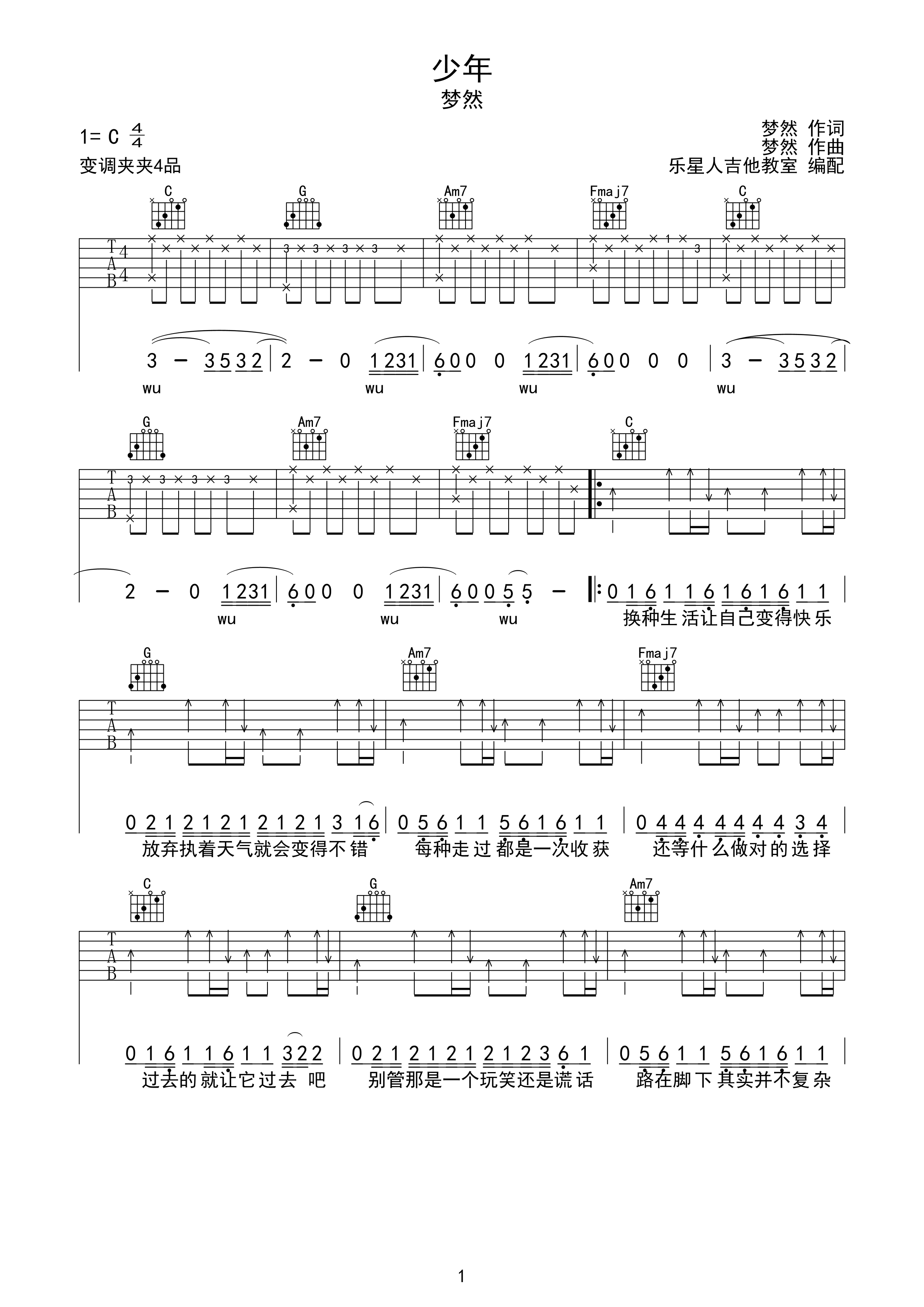 梦然《少年》吉他谱-c调弹唱伴奏六线谱-吉他专家