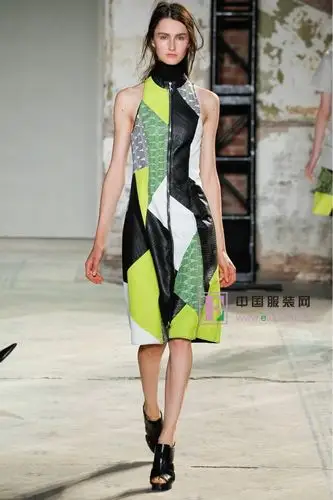 衣服材质是多种多样,无袖女装采用异国气息的几何图形的皮革块拼接而