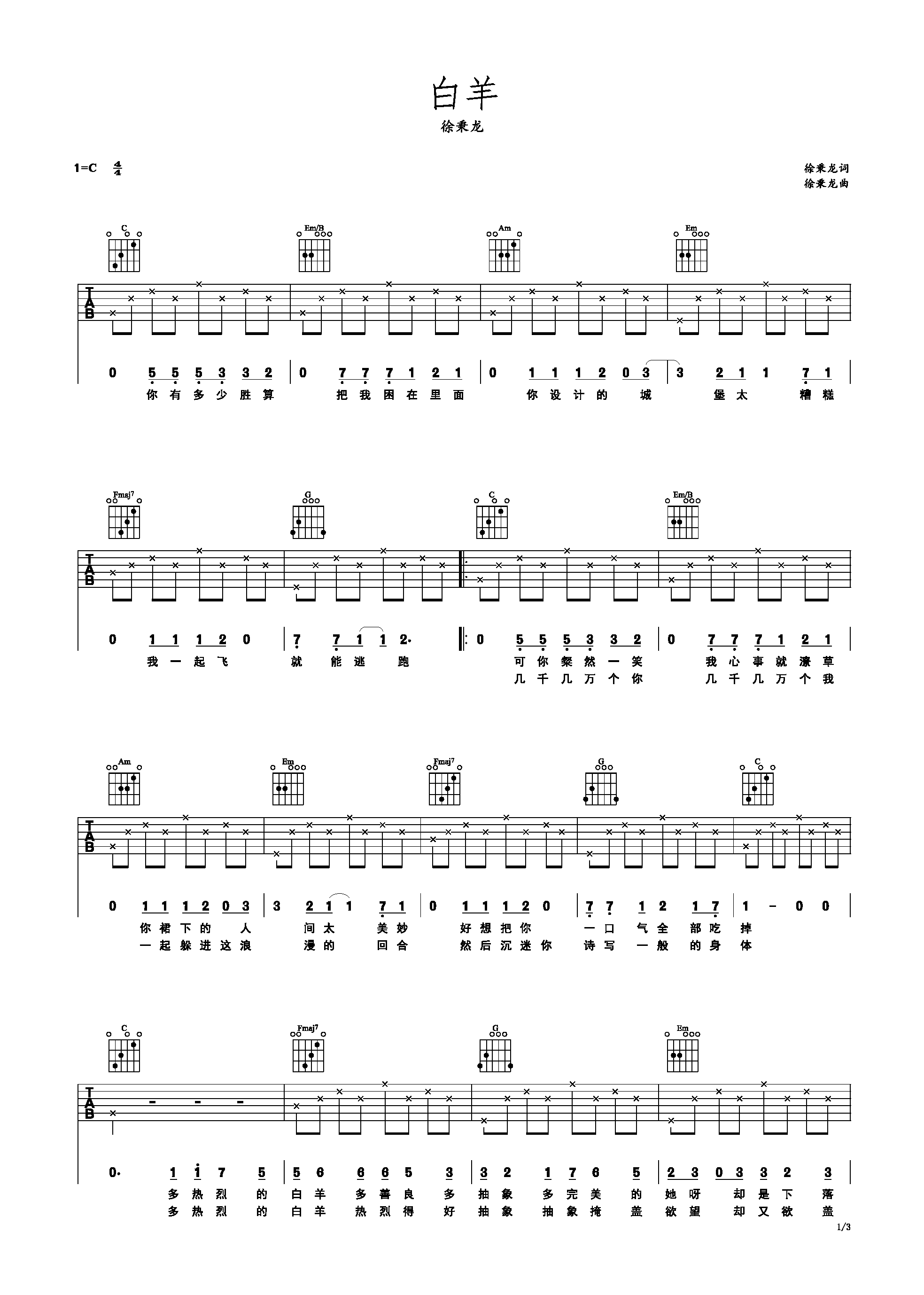 白羊吉他谱-c调简单版-徐秉龙《白羊》吉他弹唱谱-图片谱