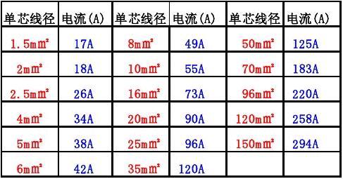 电流与电缆对应表
