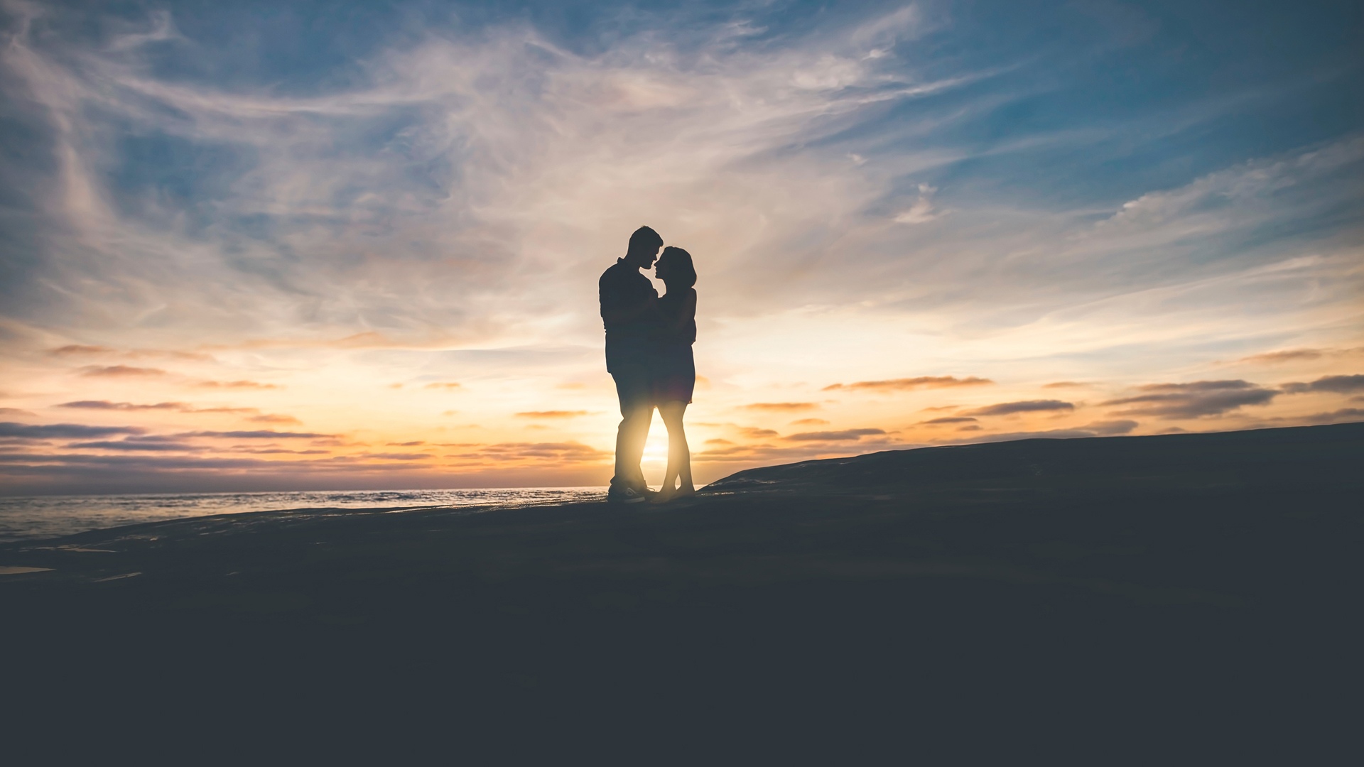 夕阳下的情侣拥抱亲吻