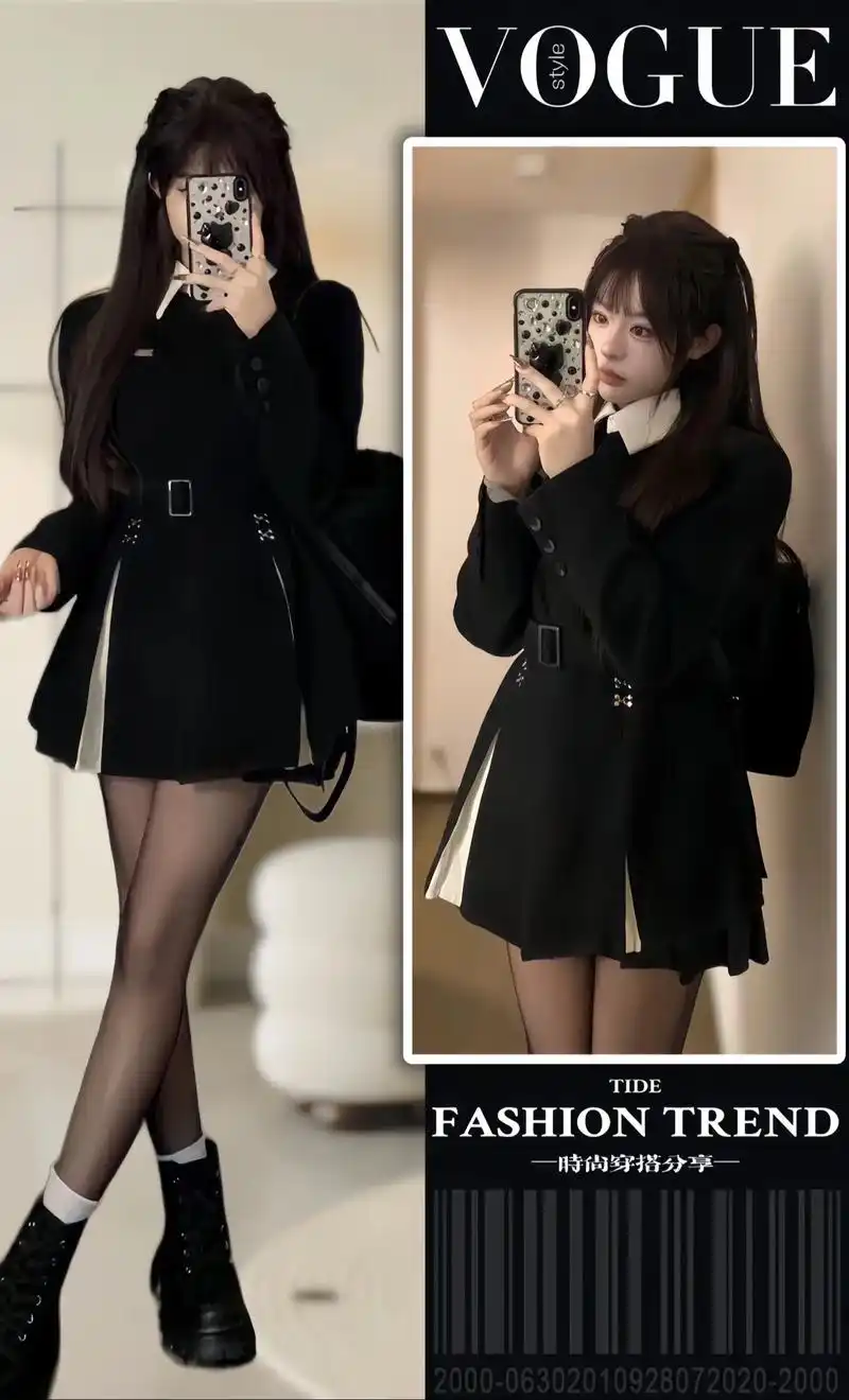 今日穿搭-黑色短款撞色小西装裙