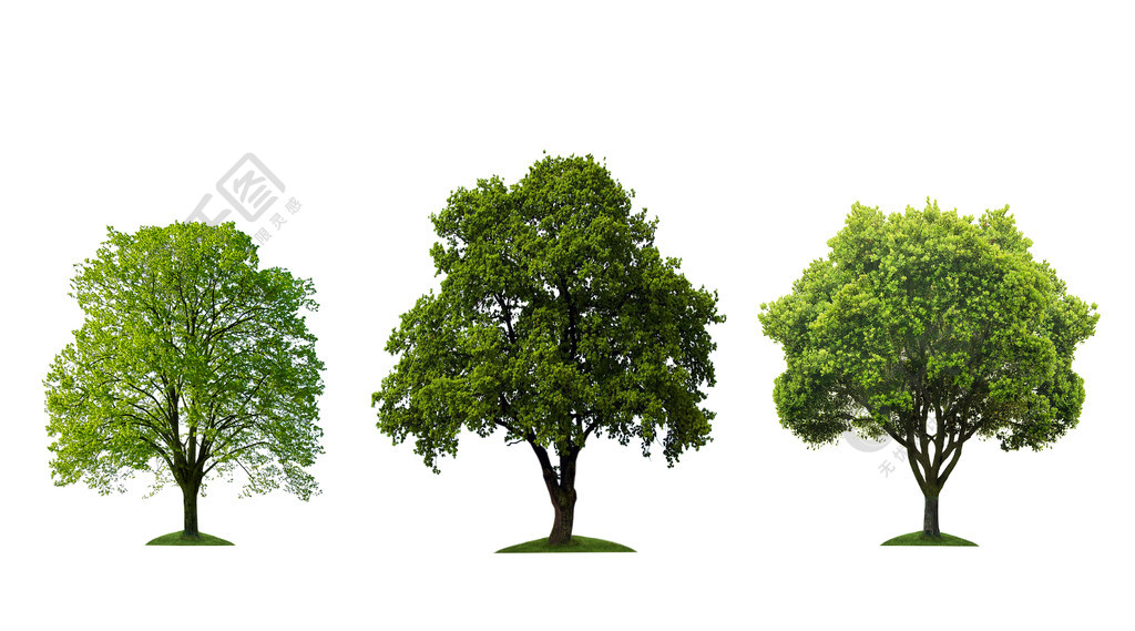 绿树,在绿色的叶子,孤立的白色背景上的三个树上设置