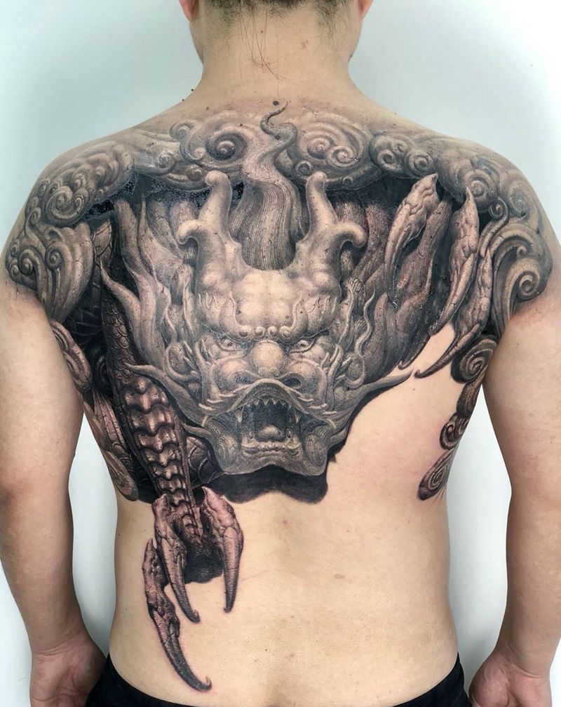 岳阳新刺客张卓青的石雕迦尼萨立体背部纹身作品欣赏
