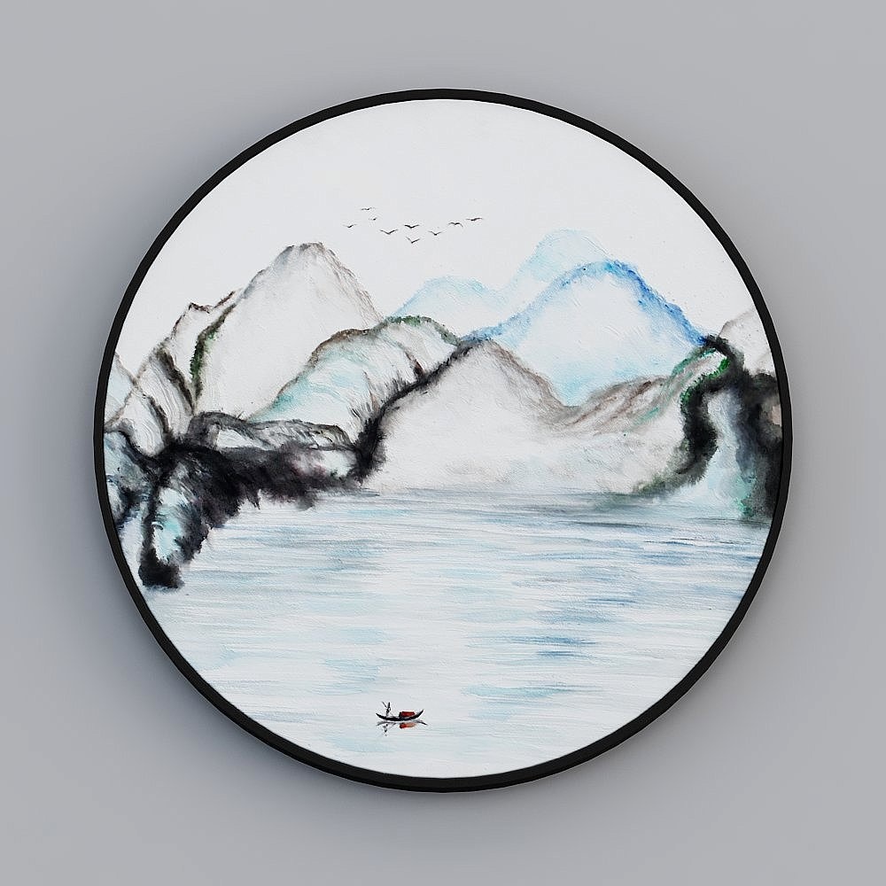 优梵艺术现代中式山水油画背景墙挂画圆形玄关家居装饰有框立体画--云