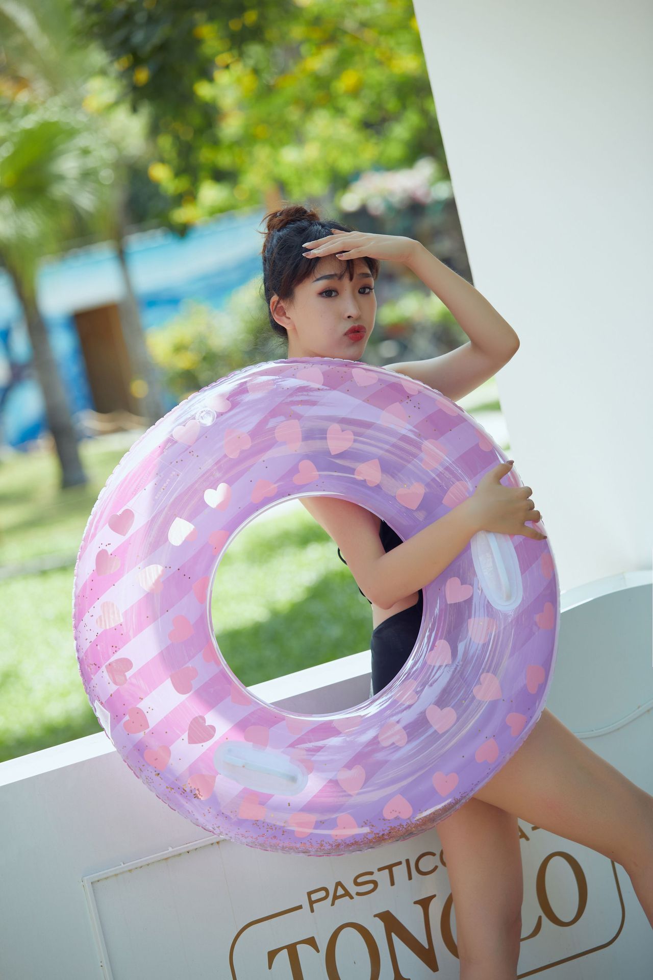 海边拿游泳圈的女子