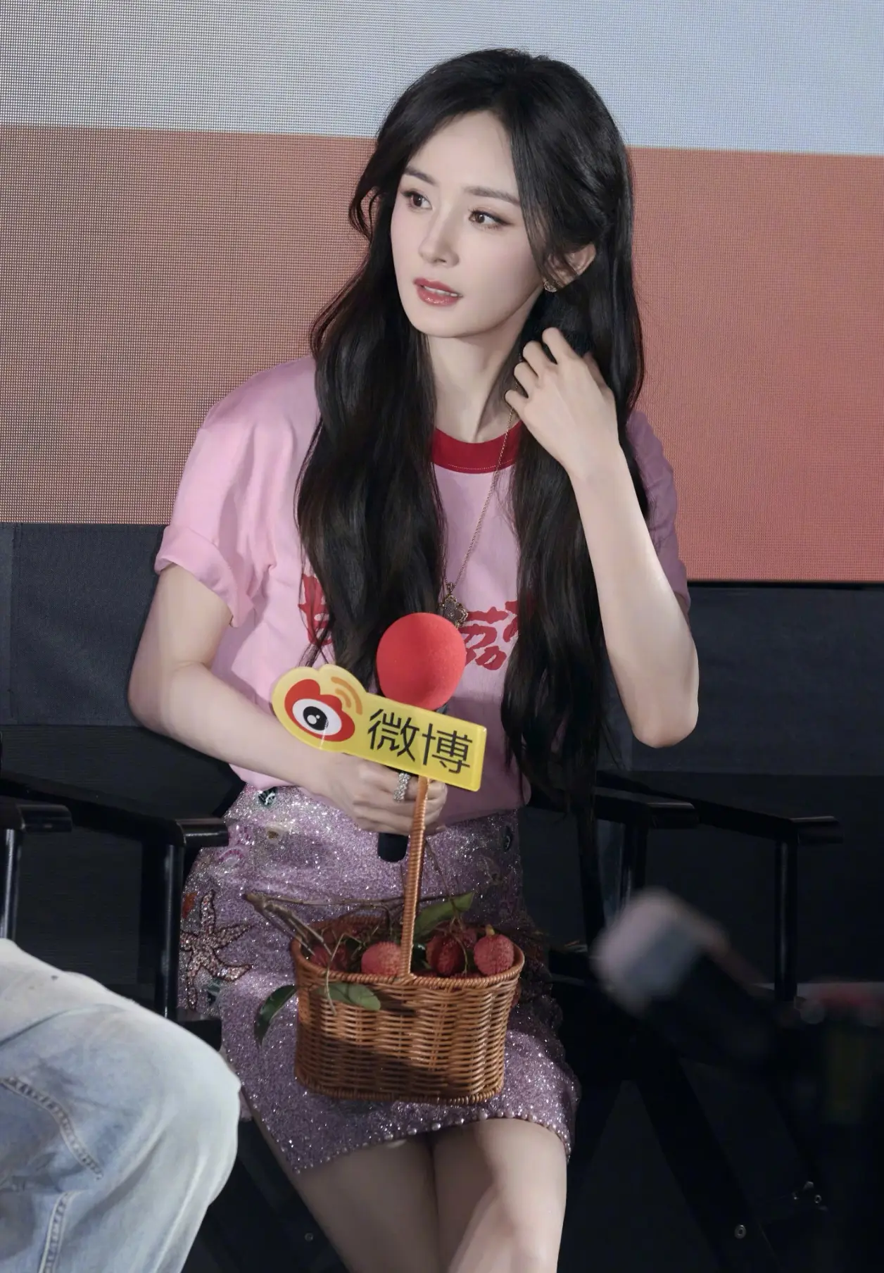 杨幂身着粉色t恤,娇嫩感十足