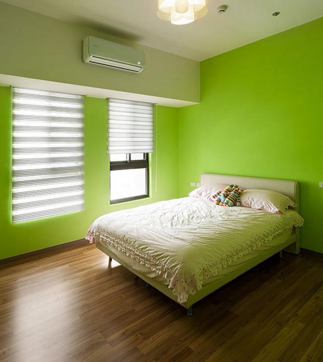 主卧室依然以绿色为基色调,白色竖条的装饰条让墙面不再单调,多出来