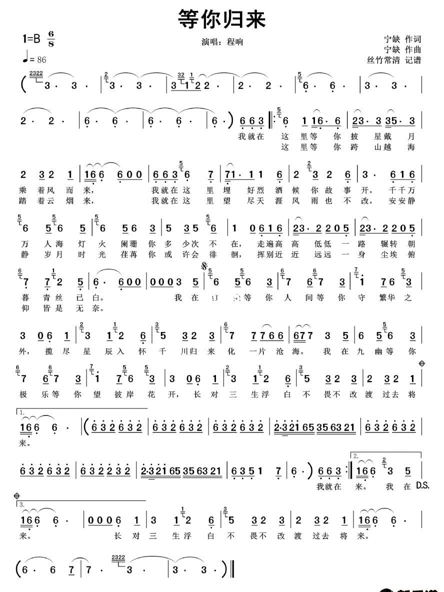程响《等你归来》简谱分享_简谱_曲谱_娱乐_音乐