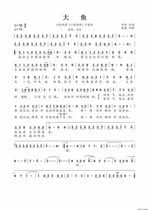 大鱼(《大鱼海棠》动画电影印象曲) 周深 歌谱简谱网