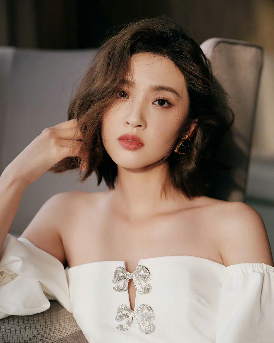 唐艺昕微卷齐肩短发,一字肩泡泡袖连衣裙,优雅迷人#我们都爱聊八卦