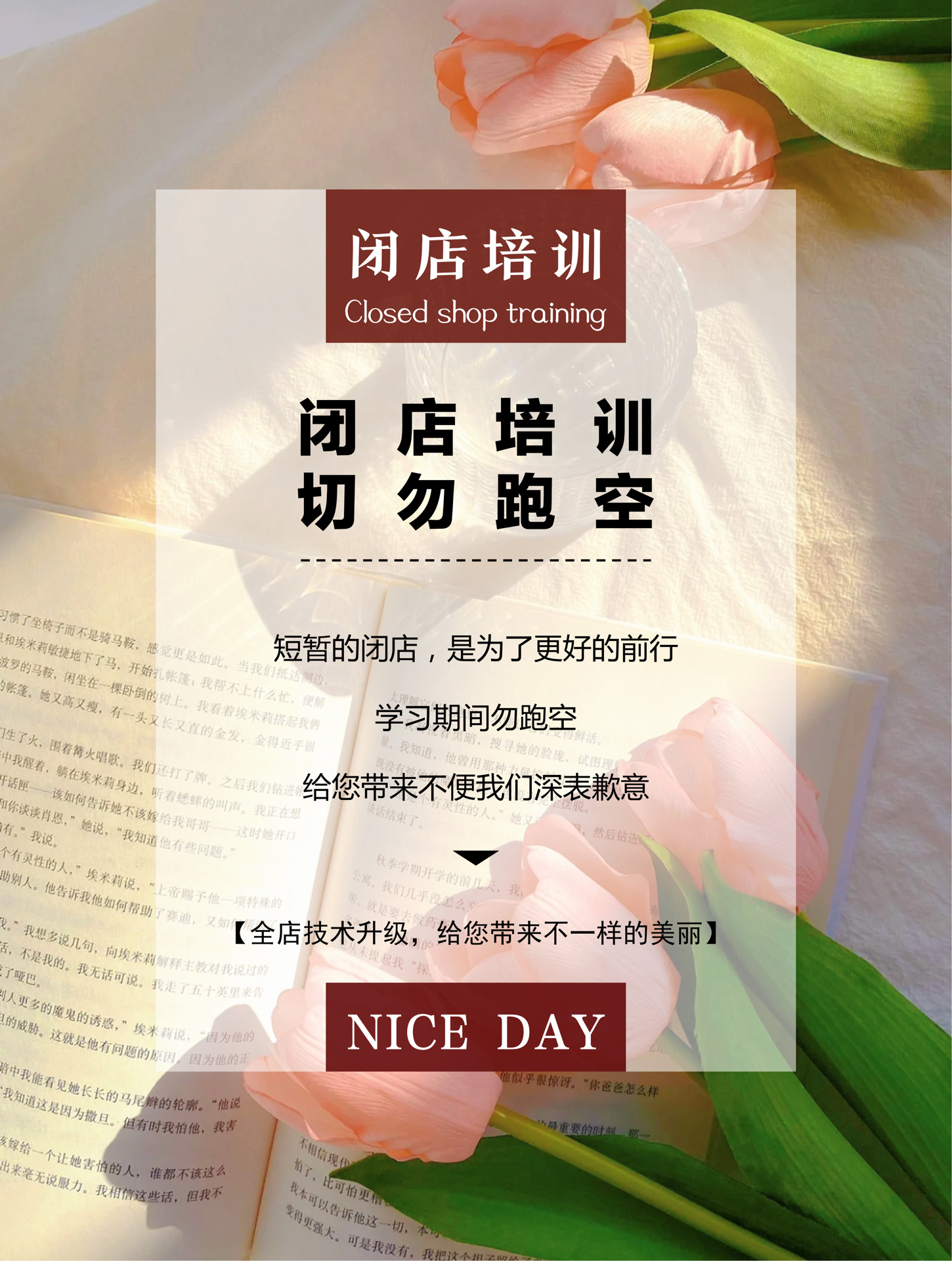 美容院闭店通知海报|附送文案内容 91文案内容: 02 闭店培训 切勿
