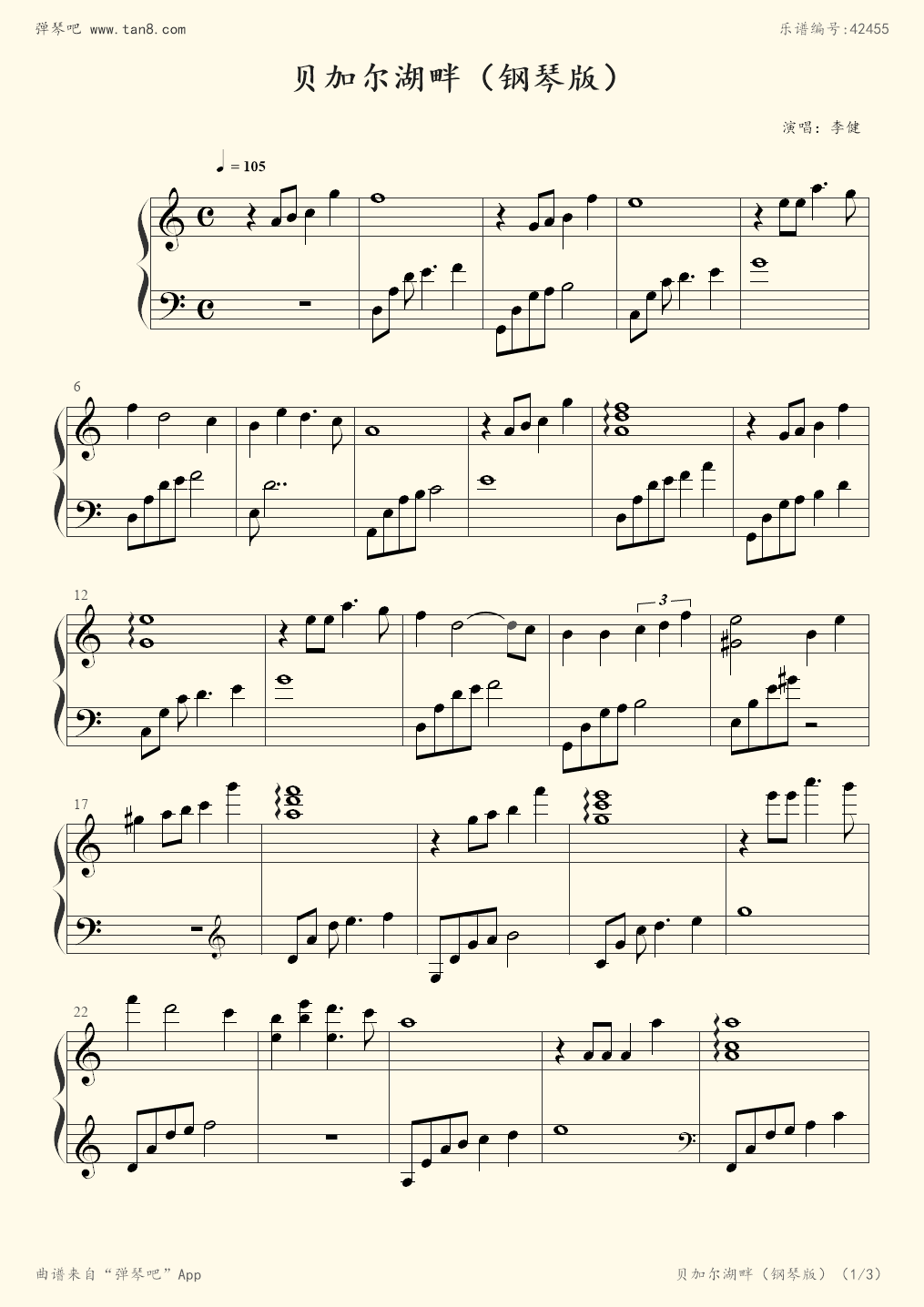 贝加尔湖畔钢琴谱_李健_c调 _流行钢琴谱五线谱独奏谱_钢琴谱|钢琴