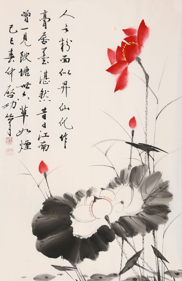 郑晓京写意荷花国画《盆莲》来源:易从网这是一幅竖幅水墨荷,以大写意