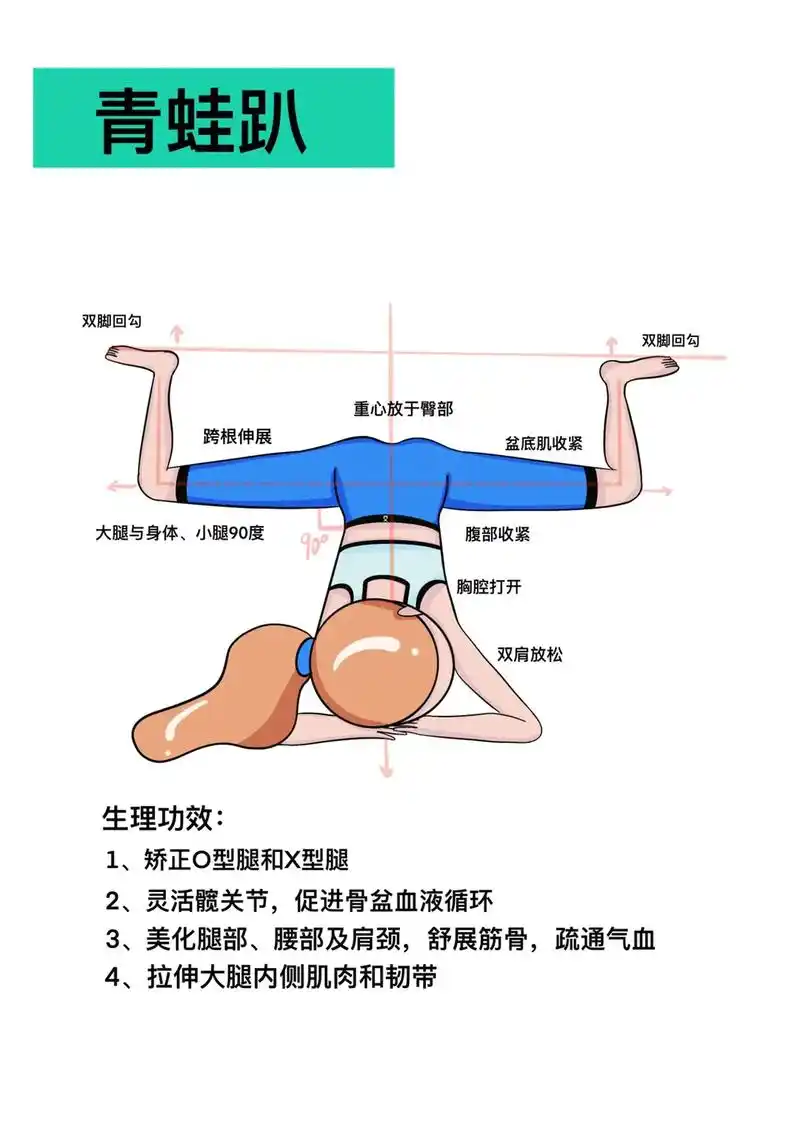 趴小青蛙:胯根贴地,大腿保持在一条直线上,肚子贴地,每天趴二十五分钟