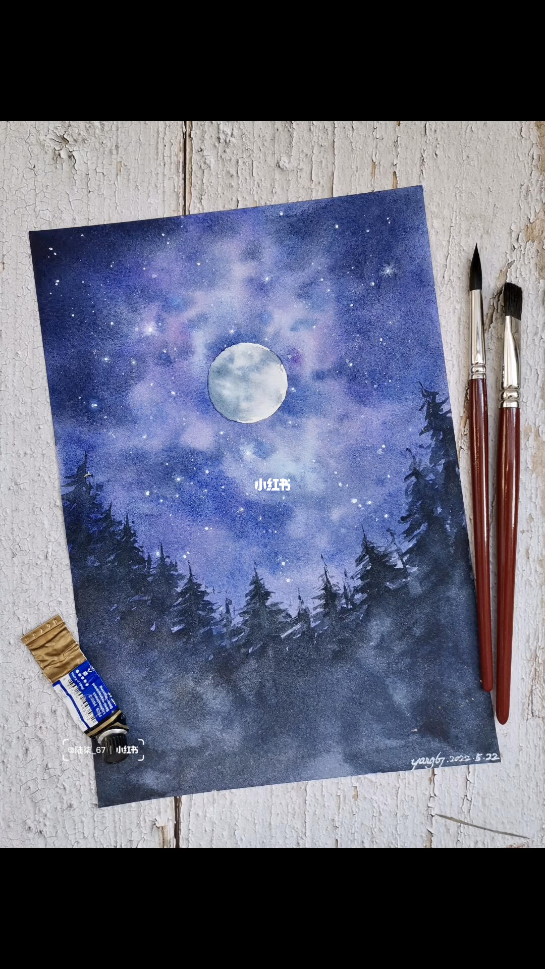 水彩满月星空绘画过程