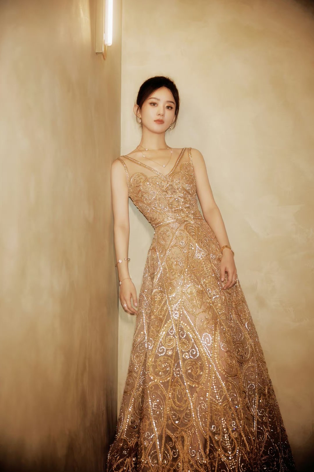 赵丽颖# 身穿金色刺绣透视裙,清纯妩媚的眼神,肤白貌美的容颜,白皙