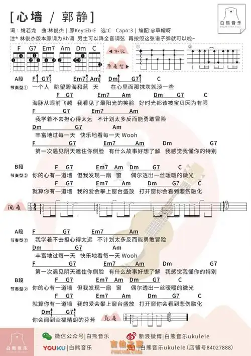 郭静林俊杰心墙尤克里里弹唱谱及教学视频白熊音乐