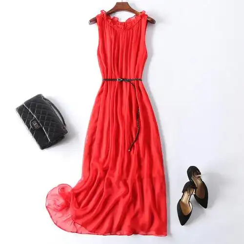 中长款紫色修身无袖真丝连衣裙