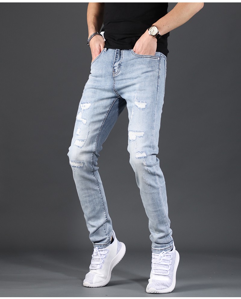 墨森尼破洞牛仔裤男潮牌修身小脚浅色秋季潮流乞丐休闲弹力男士裤子 s