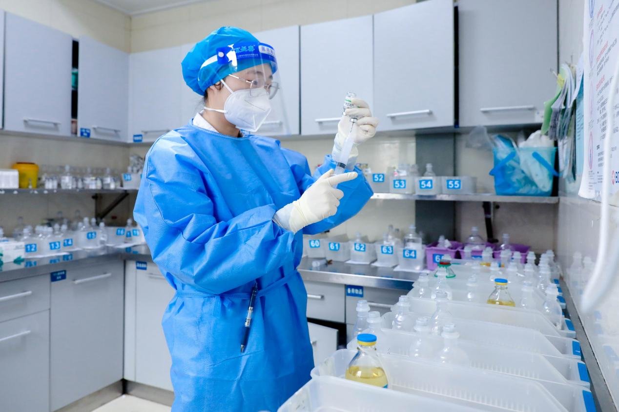 2月16日,在河南省急救中心抢救室,护士汪涵在为患者配药.