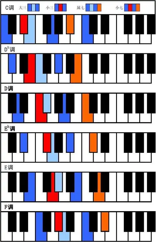 青歌钢琴和弦指法图 彩色初学者钢琴键盘和弦谱 钢琴指法表