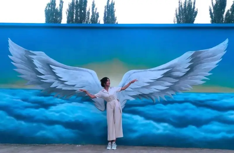 里村口看到天使的翅膀墙绘,第一眼就心动了,情不自禁地过去打卡拍照