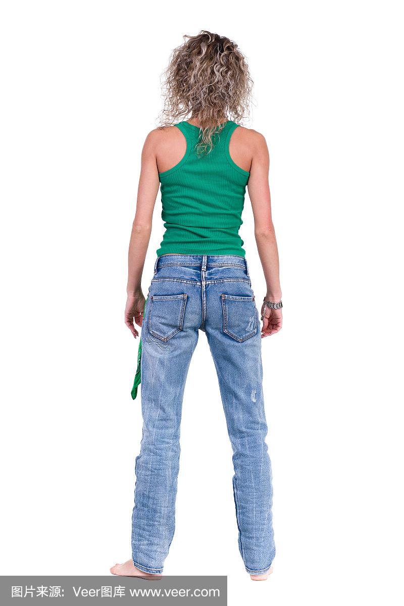 穿牛仔裤和休闲衫的女孩的全长肖像站立姿势孤立在白色工作室背景上