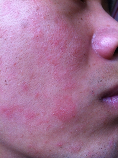 脸上起了一片片的红斑,又疼又痒,一片片的,像是癣一样,一个星期了