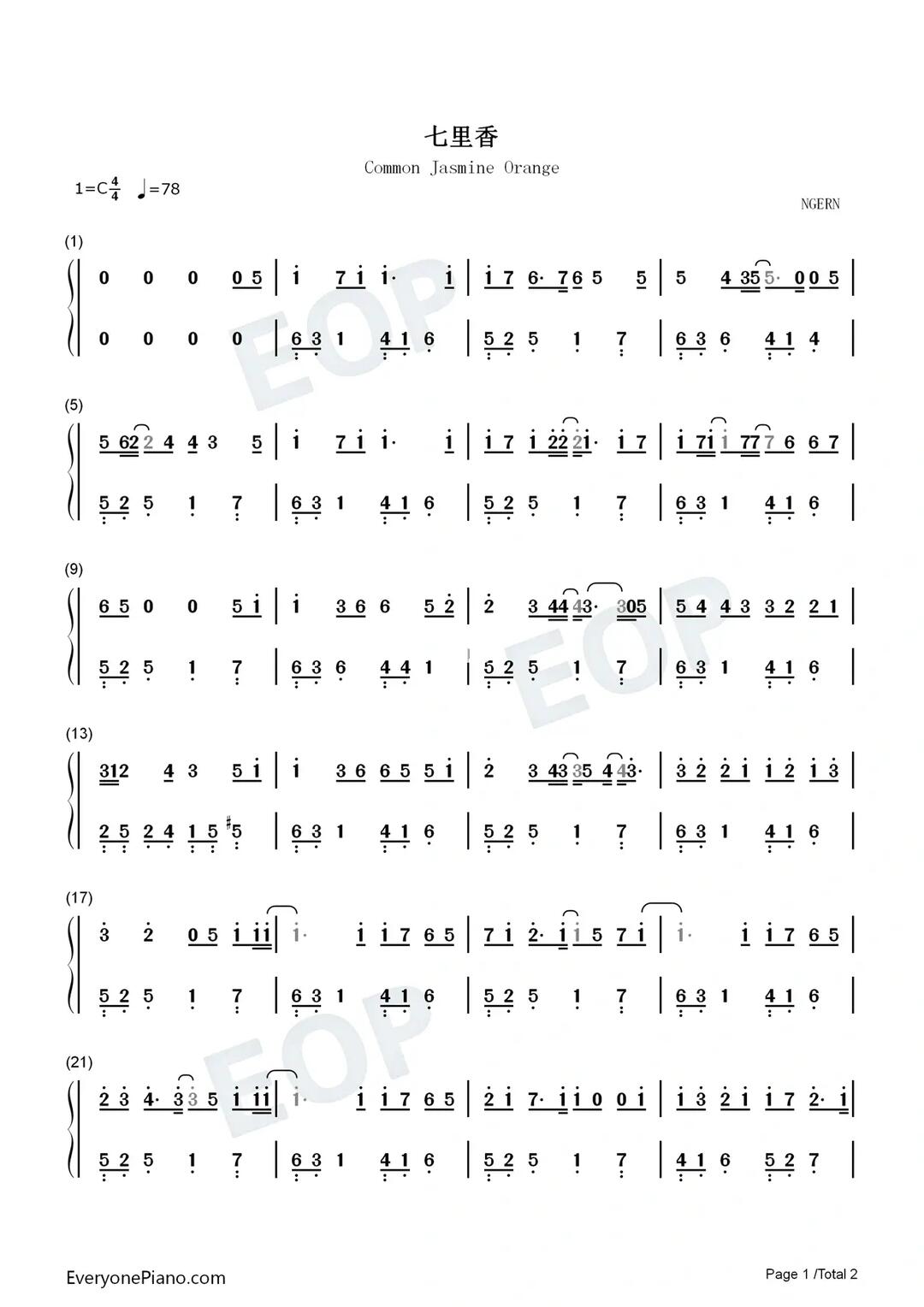 七里香-周杰伦双手简谱预览1