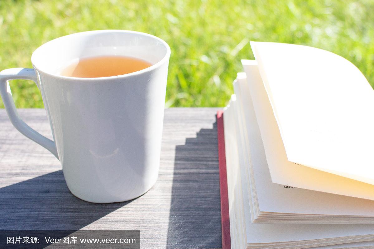清晨,木桌上放着一杯茶和一本书
