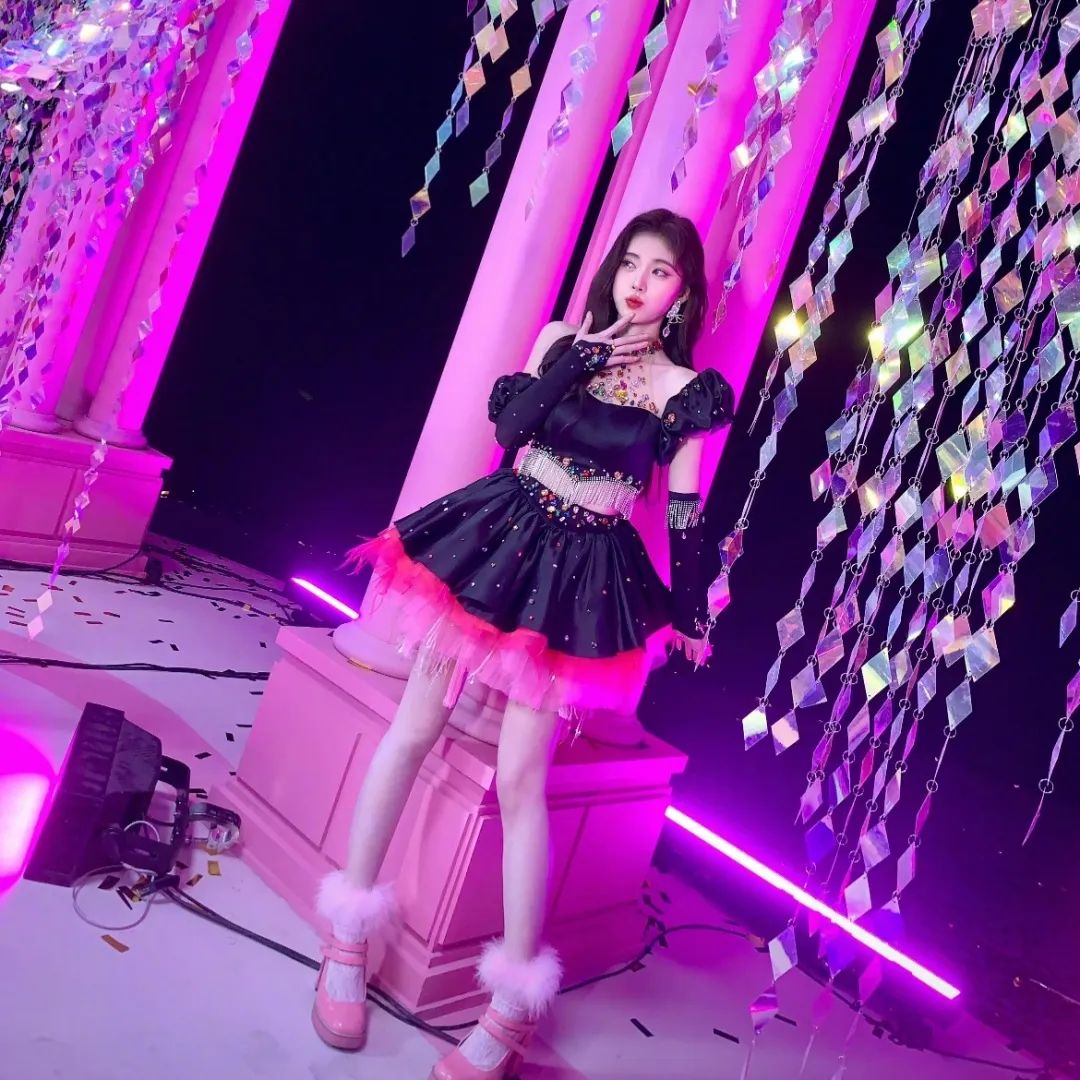 鞠婧祎新歌上线,舞台照流出,穿黑粉露腰小短裙甜美灵动 妩媚撩人_少女