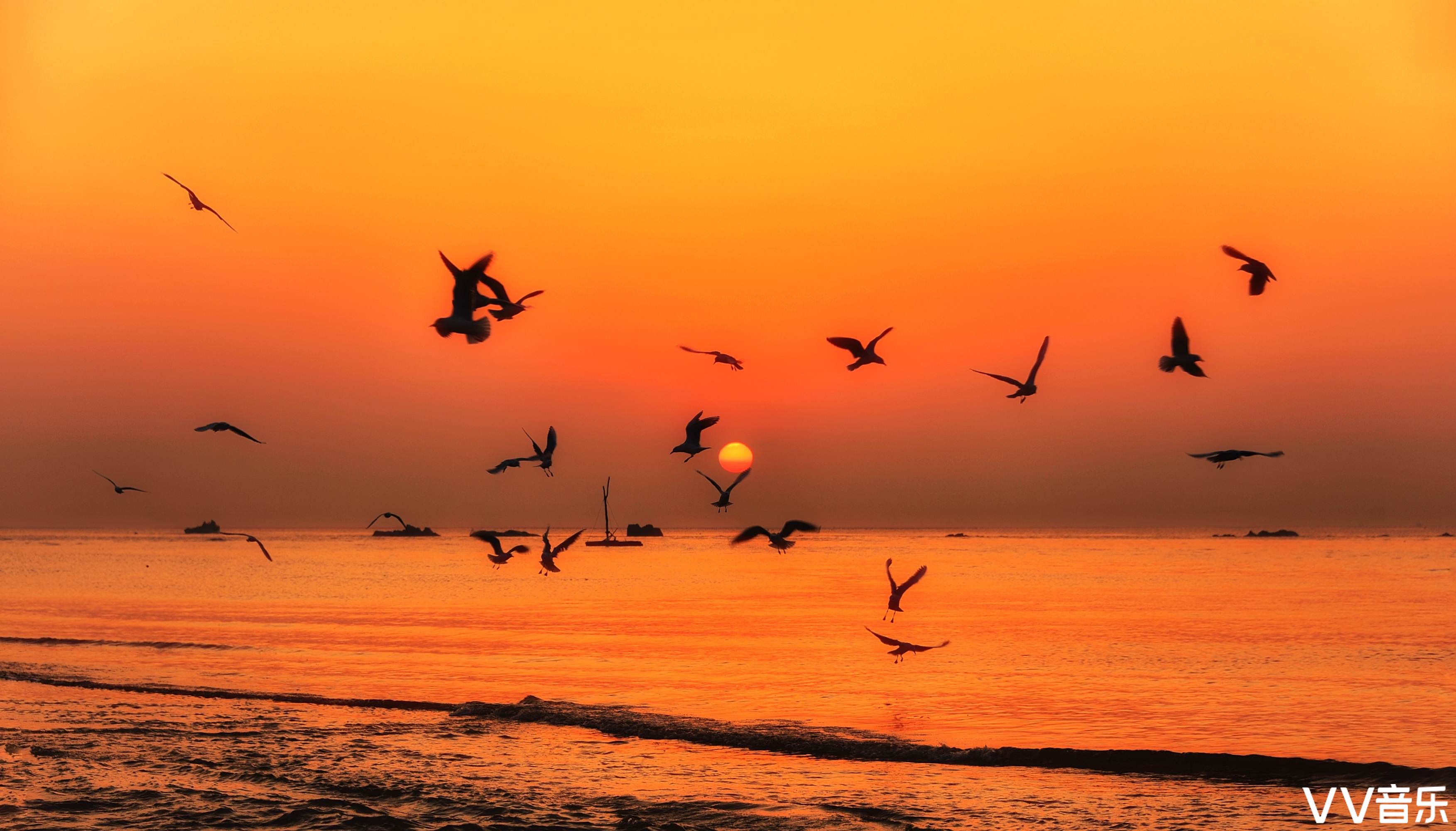 美丽的日落,一群海鸥飞过海面.海鸥在蓝天的云朵里.