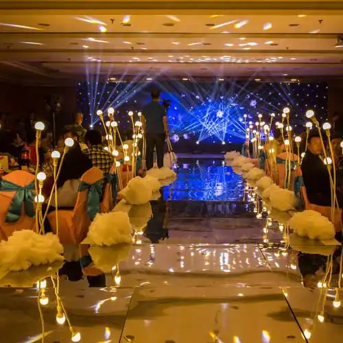 温暖灯光和垂吊云朵装饰的婚礼现场