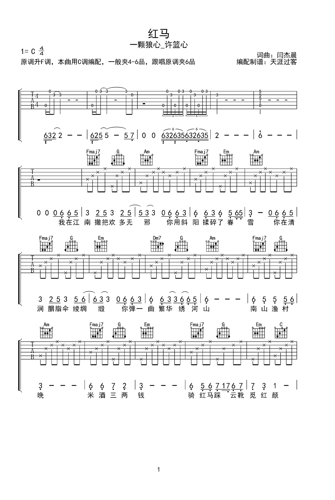 红马c调弹唱c调六线pdf谱吉他谱-虫虫吉他谱免费下载