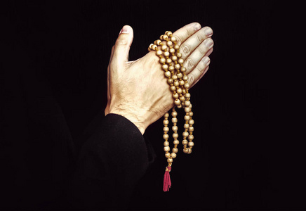 祷告的双手双手合十在祈祷上孤立的黑色背景.在祷告中牧师.